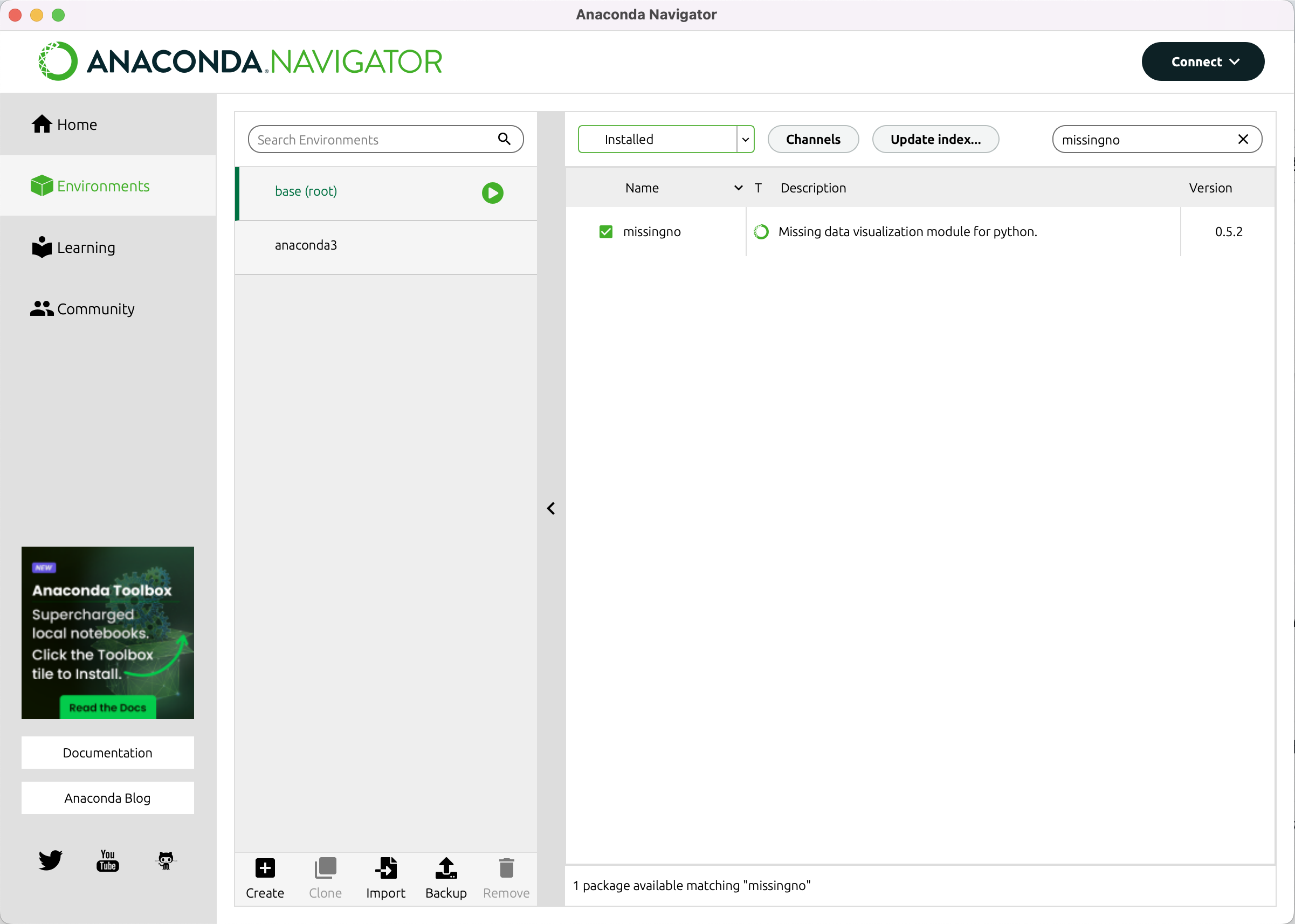 - 아나콘다 설치 확인: 기본 Env로만 사용하는 상태 - base(root) 환경에는 설치내용이 체크되어 있음