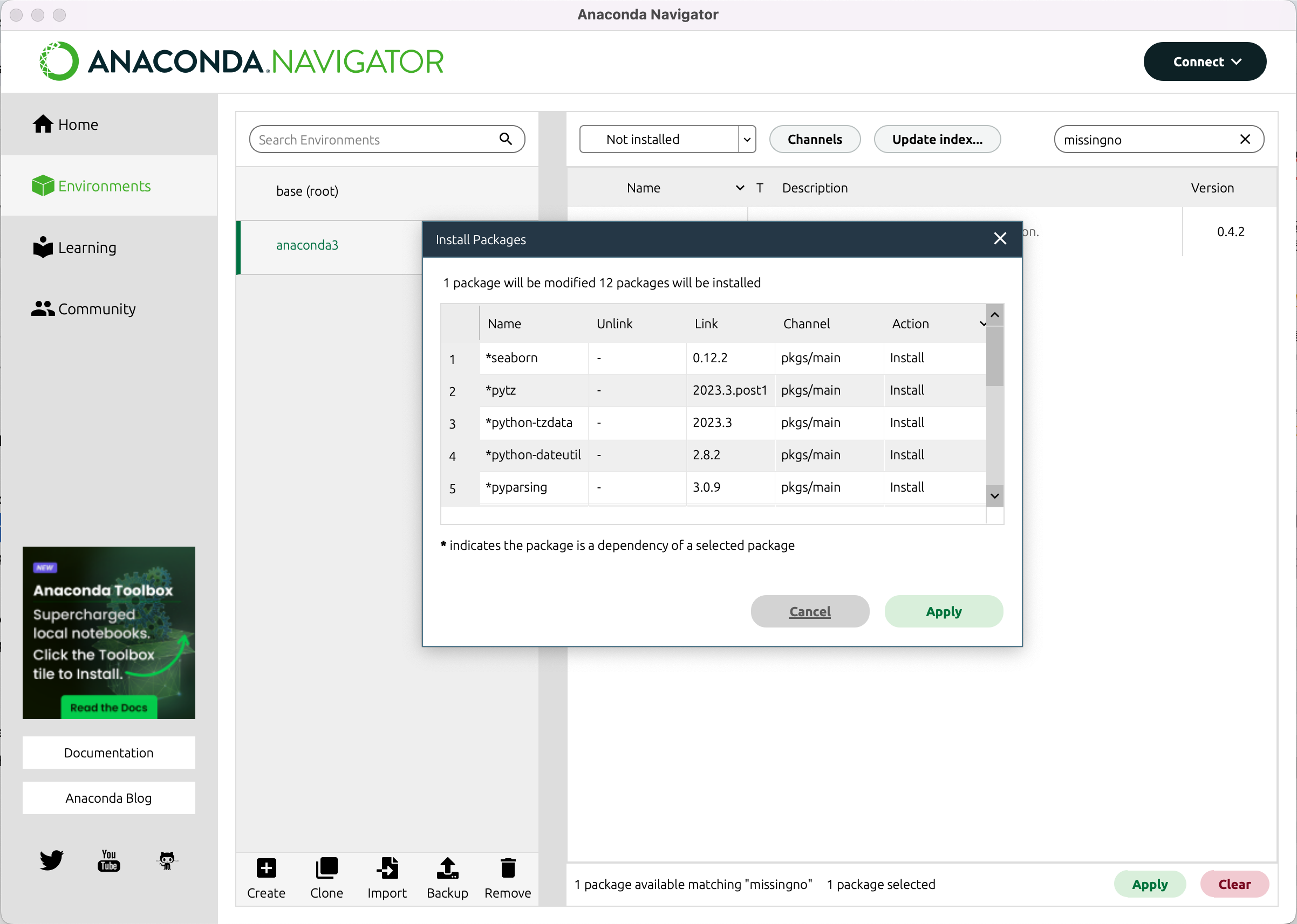 - 추가 환경 구성: anaconda3 환경에서 해당 라이브러리를 체크하고 "Apply"