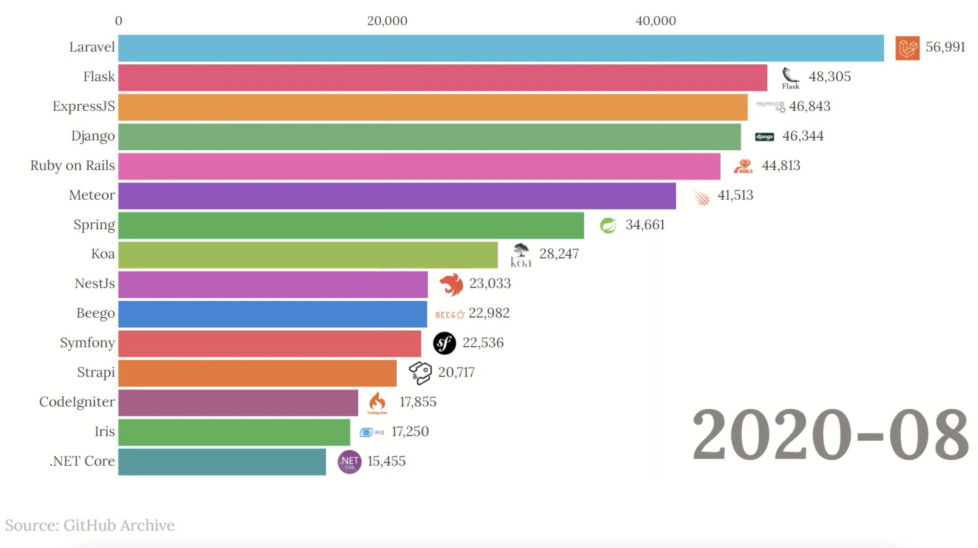 2012 - 2020년 까지의 Languages, Backend Frameworks, JavaScript Frameworks 의 사용량에 대한 변화를 정리해둔 자료가 있어서