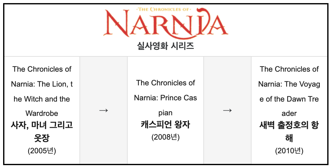 영국의 시인이자 수필가, 비평가, 소설가인 C. S. 루이스의 총 7편의 판타지 소설을 일컫는다. 사실 명석하며 신랄하기까지한 저서들로 유명한 루이스가 어린 아이들을 위해 만든 시리즈다. 때문에 스토리상 전투나 전쟁에 대한 묘사를 세밀하게 표현하지 않는 대신 캐릭터들의 성장과 소통에 중점을 맞추는 경향이 있다. 재까지는 사자와 마녀와 옷장, 캐스피언 왕자, 새벽 출정호의 항해가 영화화.... - 나무위키 -