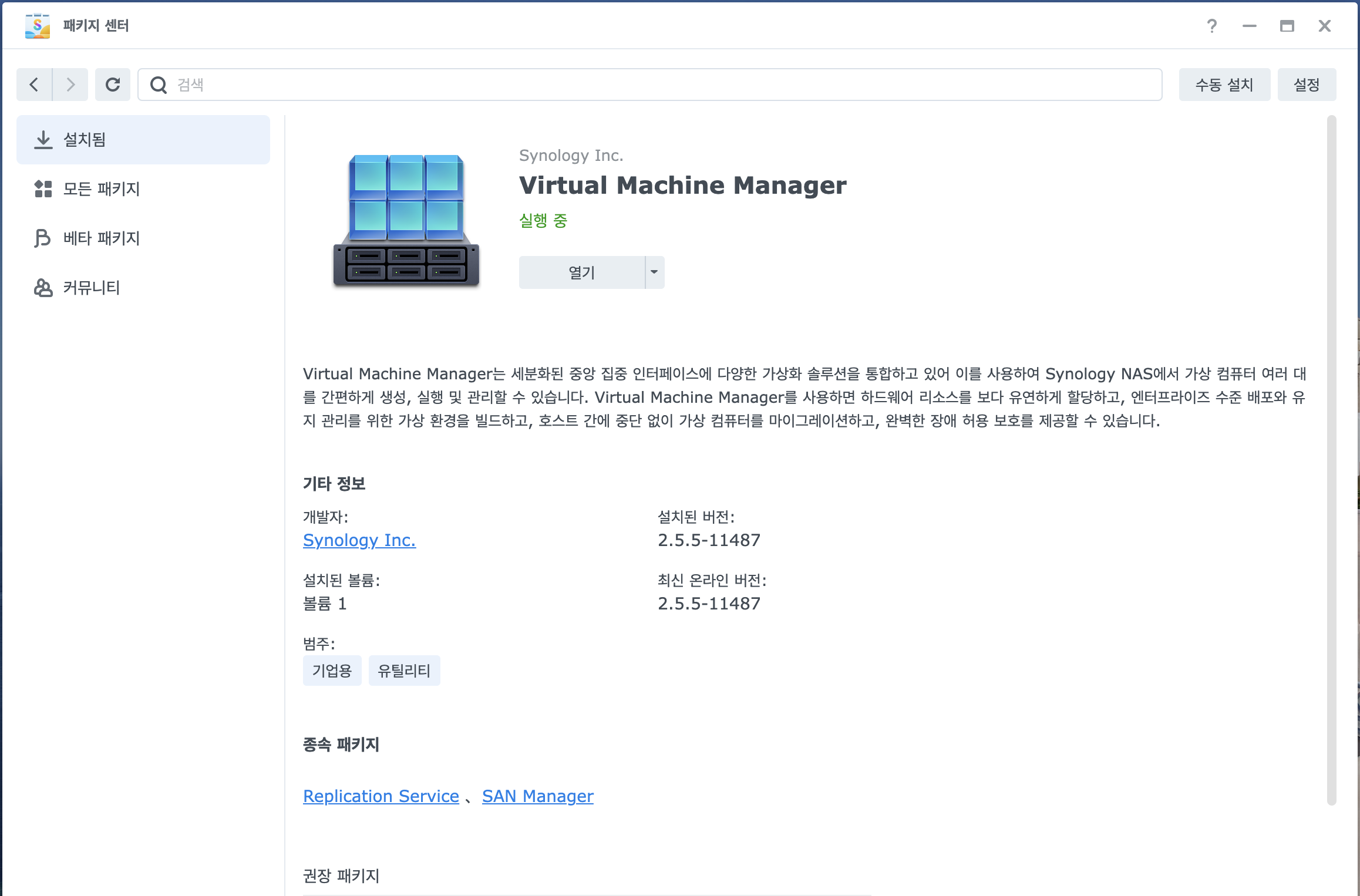 - 시놀로지 패키지 센터에서 'Virtual Machine Manager' 패키지를 선택하여 설치 합니다.