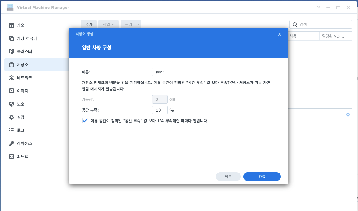 - '볼륨1'을 선택하면 '일반 사양 구성' 창이 나타나며, 사용할 저장소의 이름을 입력하고 다른 옵션은 그대로 사용하여 저장합니다.
