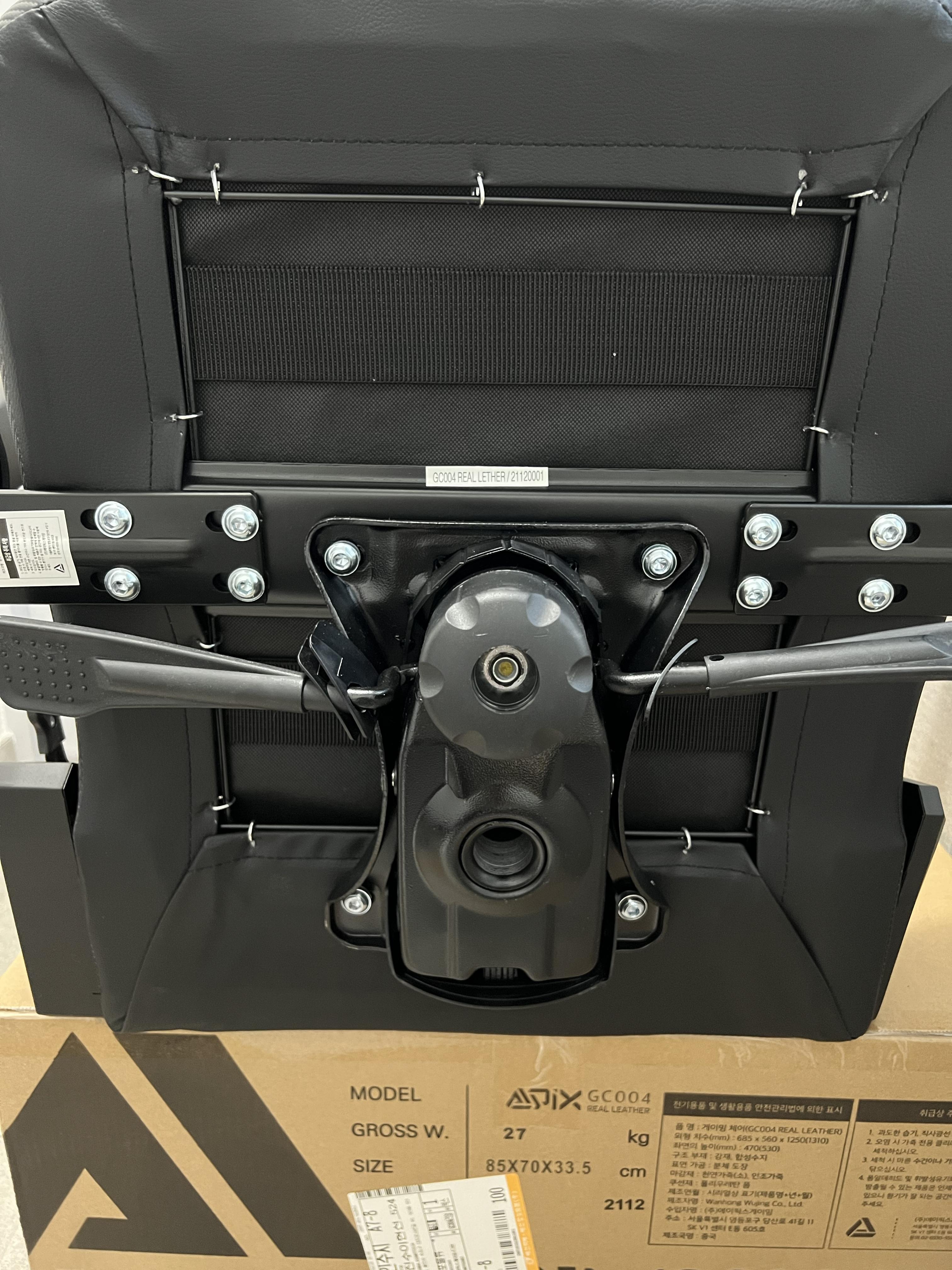 특별히 어려운 부분은 아래 조절부분의 4개 나사를 조립할때 였는데, 의자 바디 부분의 가죽이 나사 구멍을 방해하는 부분이 있습니다.